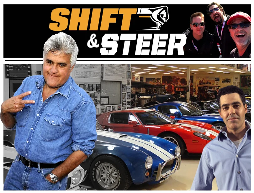 In this episode of Shift and Steer Brad Fanshaw, Matt D'Andria and Aaron Hagar go the valley to see some of the coolest cars around. First the guys cross-over and do an episode of Adam Carolla's Car Cast, then they explore the shop with Adam's cars while he is away. Next Brad talks about driving the Roush Stage 3 Mustang while filming a new commercial in which he stars! Finally, the trio visits the holy grail of car guy garages, Jay Leno's Garage.